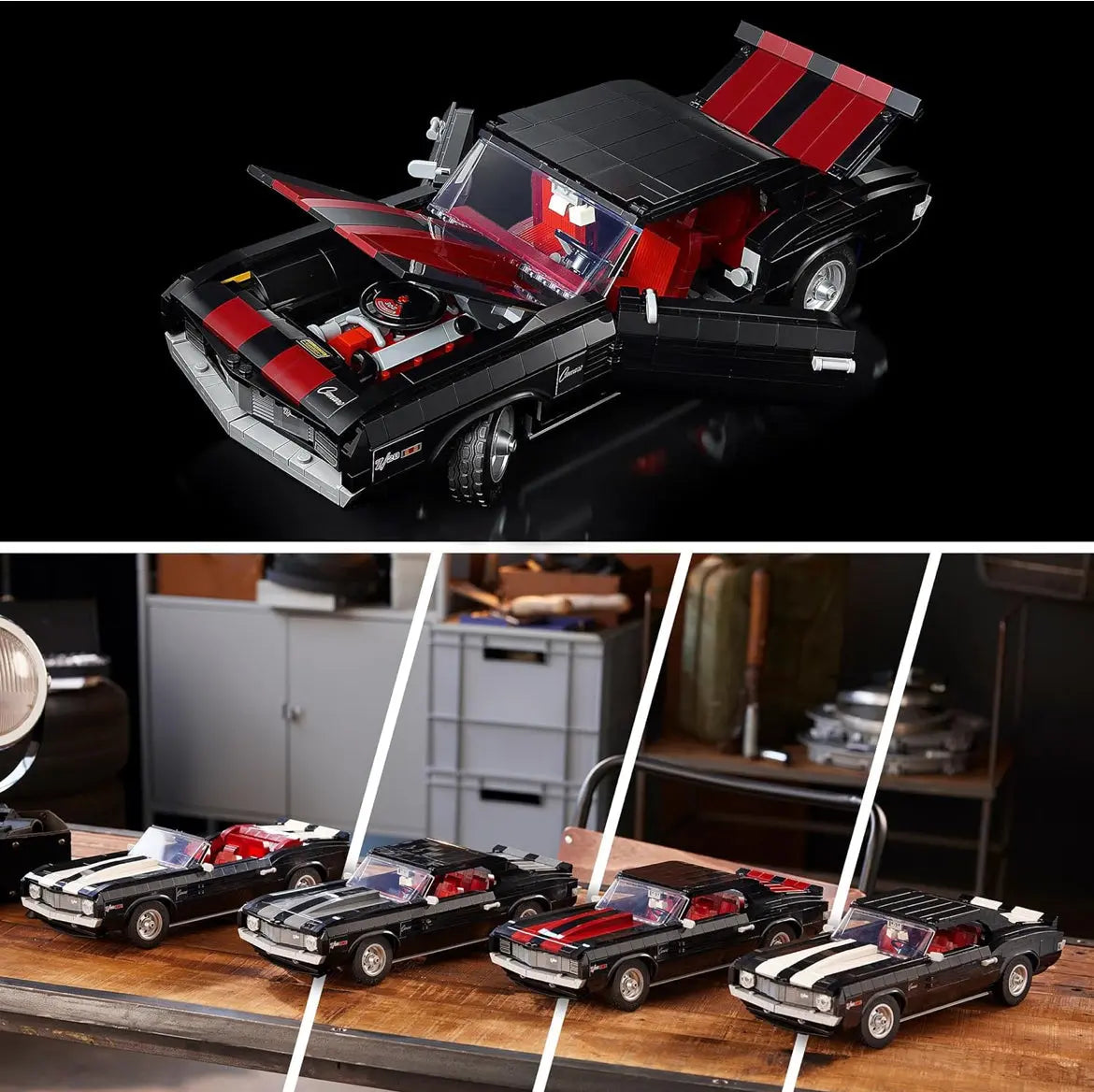 Le LEGO Icons Chevrolet Camaro se distingue par ses nombreuses options de personnalisation qui permettent de créer une maquette unique. Toit fermé ou décapotable, phares classiques ou escamotables, bandes de course en plusieurs coloris : chaque détail peut être adapté selon vos préférences. Les accessoires inclus, comme le dé recouvert de fourrure ou la brique imprimée magazine automobile, ajoutent une touche rétro et authentique qui séduira les amateurs de modèles vintage.